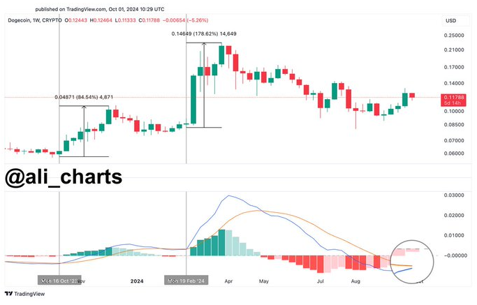 암호화폐 분석가 알리 마르티네즈는 도지코인의 이동평균 수렴확산(MACD)지표에서 강세 크로스오버가 발생할 가능성이 있고,